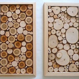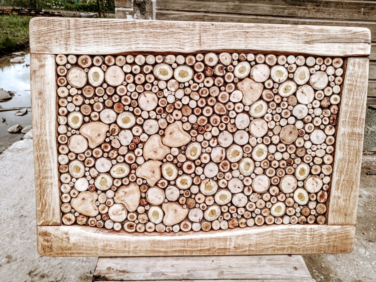 Если использовать разные породы дерева или цвета спилов, то можно собрать настоящие картины или простую геометрическую мозаику. В этом варианте лучше всего будут смотреться квадратные и прямоугольные плашки, но, можно взять и круглые – получится тоже интересно. Если нет возможности найти готовые детали нужного цвета, их можно окрасить при помощи морилки или оттеночного лака.
