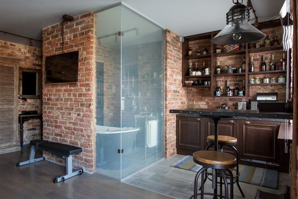 Главный акцент лофта — кирпичная кладка. Совершенно не обязательно, чтобы все стены были из кирпича или его имитации, это вполне может быть одна стена, скомбинированная с другими, на которые нанесена штукатурка (не идеально ровно, а с небрежными «дефектами»), либо же они могут быть окрашены в холодный цвет.