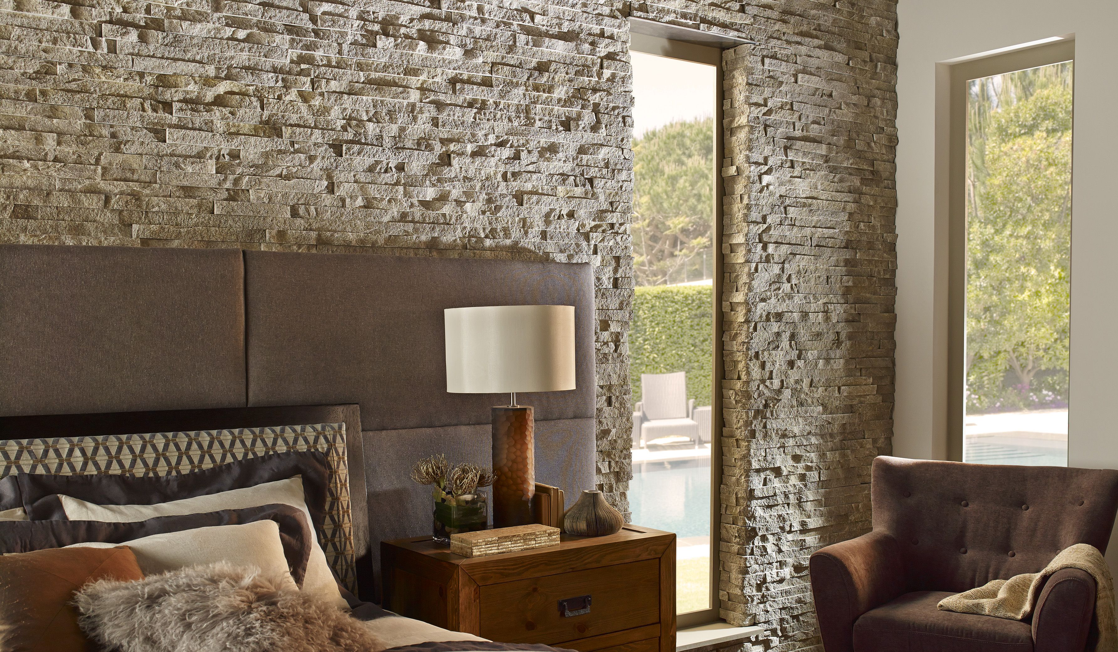 3. Спальня. При использовании камня вместе с другими деталями интерьера из натуральных материалов, можно создать благоприятные условия для отдыха, расслабления и качественного здорового сна. Выберите рельефную текстуру естественных цветов, она создаст уют и комфорт, особенно если интерьер состоит из деревянной массивной мебели, балок на потолке и натуральных меховых ковров на полу. Глянцевые декоративные камни создают ощущение холода и тревоги, поэтому от такого варианта для спальни лучше воздержаться.
