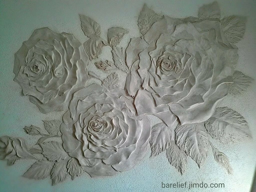 Фактура штукатурки «Розы». Чтобы украсить интерьер розами на стенах, будет достаточно скомкать в руках кусок полиэтиленовой пленки и мягко прижать его к сырой шпаклевке. Получился отпечаток розы на стене.