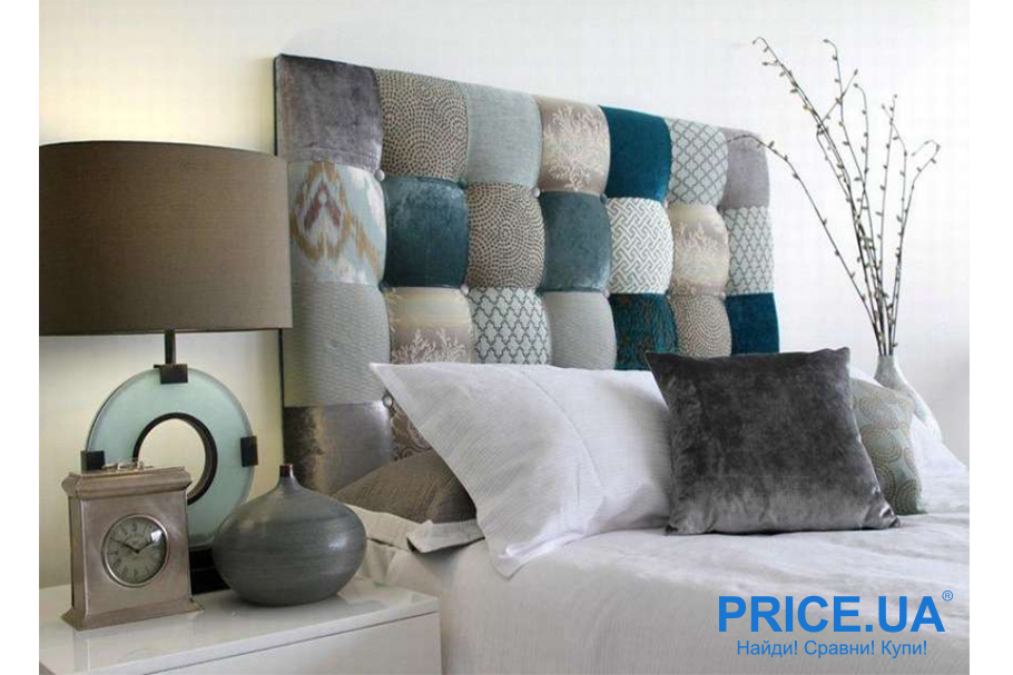 акцентная стена с лоскутной обивкой служит одновременно изголовьем кровати