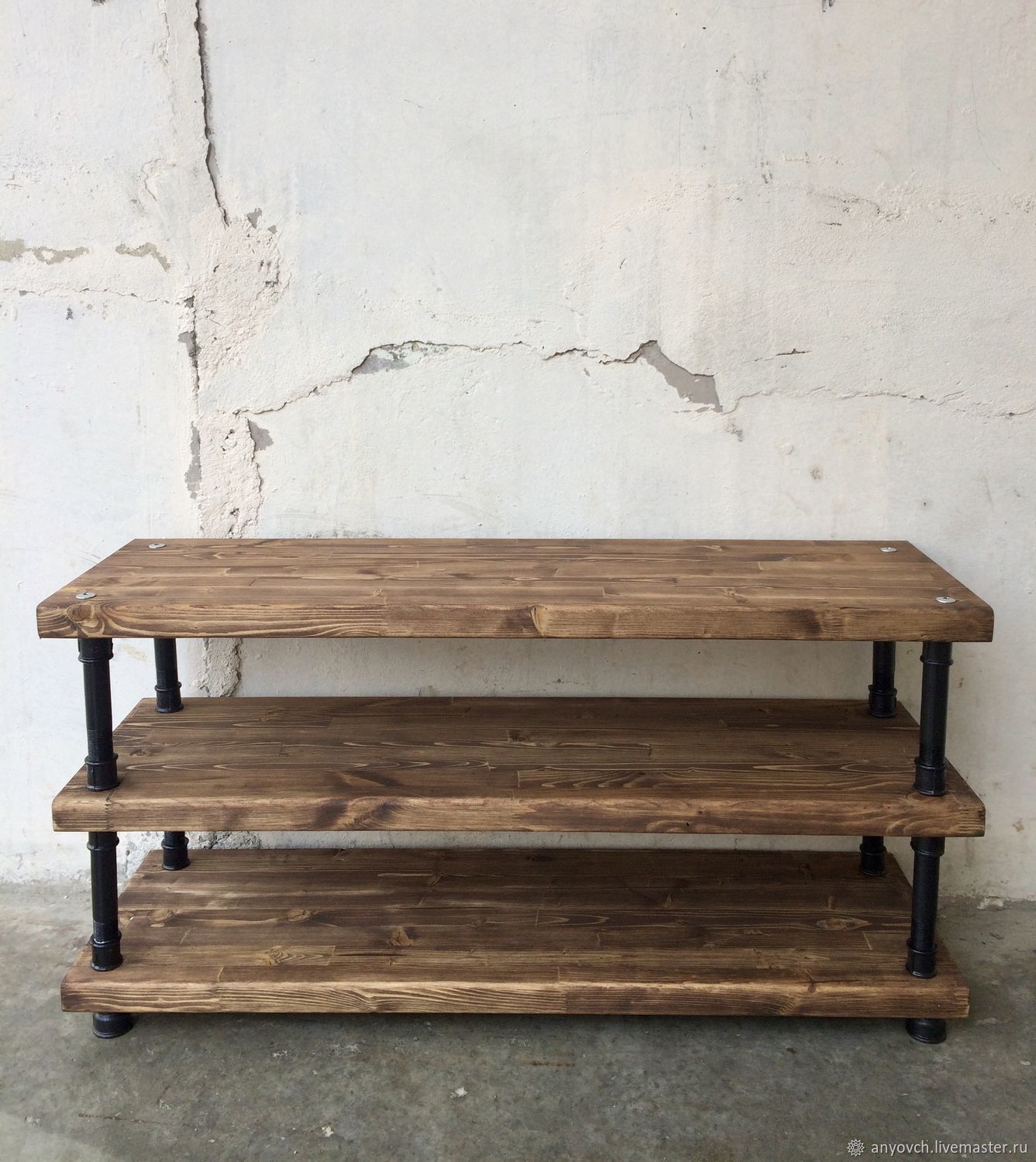 металлическая подставка и открытые полочки с сиденьем, узкая и широкая, из дерева и кованная