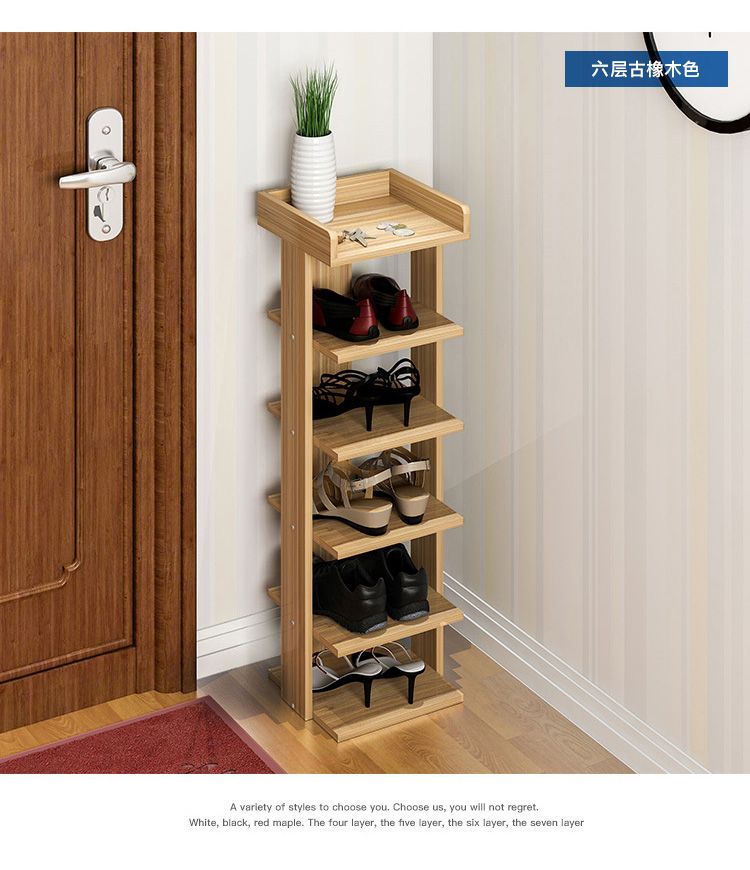 Альтернативным вариантом компактного модуля для хранения обуви является узкая этажерка. Вместимость такой полки определенно меньше, чем у предыдущего варианта, однако стоимость обычно значительно ниже. Такой вариант будет удачным решением для молодой малочисленной семьи, которая с одной стороны не нуждается в большом пространстве для хранения одной – двух пар сезонной обуви, а с другой – ограничена в выборе мебели небольшим бюджетом.