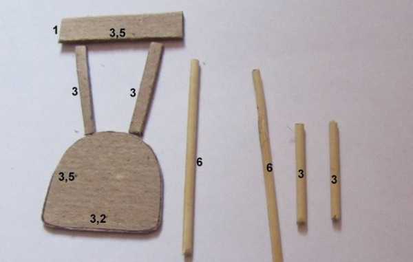 Этот почти настоящий стул для куклы можно сделать своими руками из деревянных шпажек для шашлыка и толстого картона. Вырежьте детали. Гнутые его части надо замочить на пару часов в водном растворе клея ПВА (1:1). Затем, придав нужную форму, высушите в теплом месте.