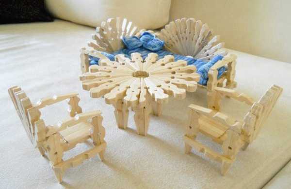 Из прищепок получаются неплохие кресла и стулья. Их разбирают на половинки и соединяют при помощи столярного клея. Получаются фигурные изделия практически за несколько десятков минут.