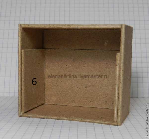 Из обрезков или из другой коробки вырезаем полки. Они должны быть немного — на 5-8 мм — длиннее и шире внутреннего пространства шкафа. Излишки загибаем так, чтобы со всех сторон образовались бортики. В углах образуются складки, их аккуратно срезаем. Одну из частей загибаем на 180° и приклеиваем к самой полке. Этой стороной полочка будет «смотреть в мир». Три остальные части загибаем под углом 90°, промазываем клеем и полки вклеиваем в шкаф. На фото справа видно, как приклеены полки. Но, чтобы места вклеивания не бросались в глаза, бортики лучше завернуть вниз.