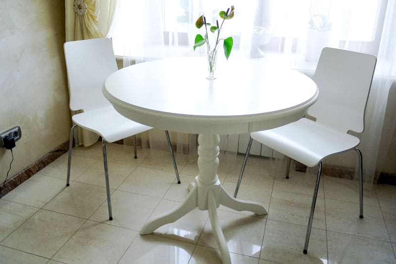 Например, для кухни, выполненной в стиле минимализм, подойдет круглая столешница из прозрачного стекла. В классическом интерьере уместно будут смотреться конструкции из натурального массива в приглушенных бежевых, белых или светло-коричневых тонах, украшенные резным декором и дополненные дорогими стульями или креслами.