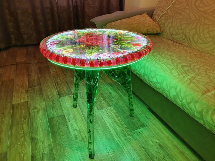 - Полужидкий состав отлично подходит для заливки круглых столов и создания декоративных элементов.