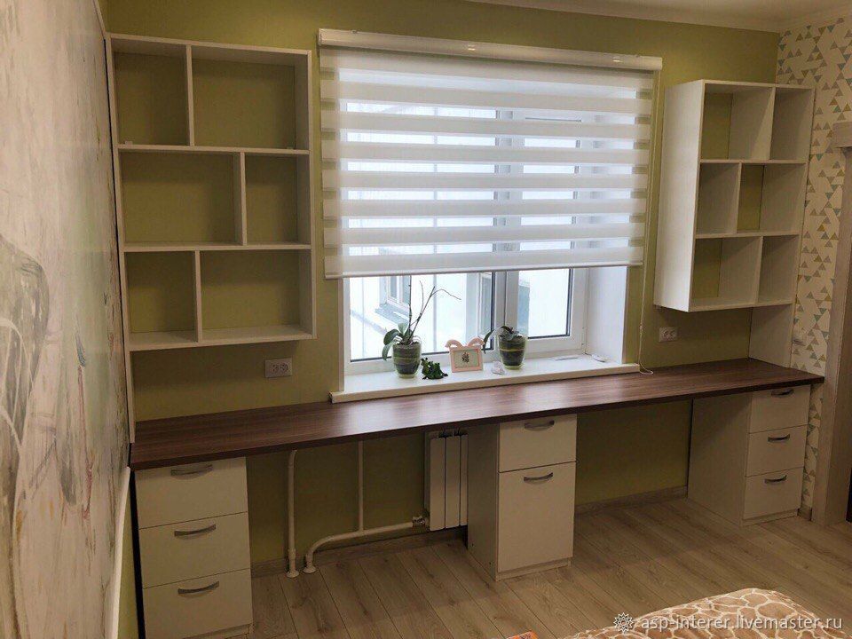 Стол возле окна: письменная и рабочая столешница с полочками вдоль окна в комнате для двух детей