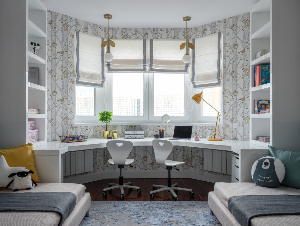 письменная и рабочая столешница с полочками вдоль окна в комнате для двух детей
