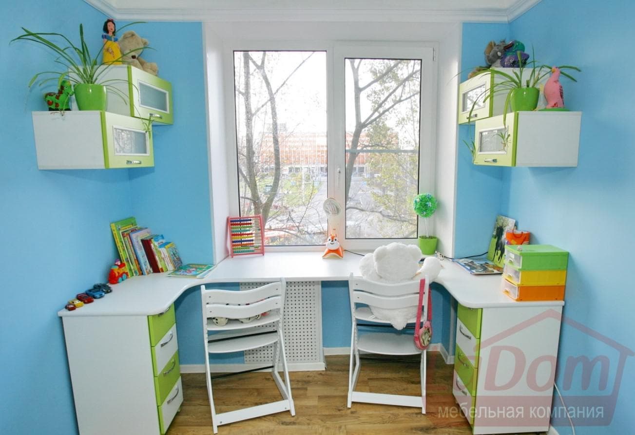 Два стола по углам. Хороший вариант, если детская достаточно широкая. Дети развернуты спиной в проход и находятся на расстоянии. Своими движениями они не мешают друг другу и каждый может заниматься домашним заданием или творчеством, не отвлекая соседа. Как и в варианте одинаковых столов вдоль окна, в комнате есть быстрый доступ к источнику свежего воздуха.