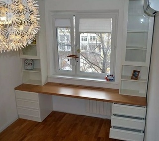 - Сэкономить место и финансы поможет установка столешницы вместо покупки подоконника и письменного стола по отдельности.
