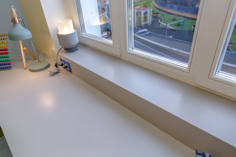 Подоконники очень популярны в жилых комнатах как столы, особенно детские. Для ребенка это получается хорошее место для подготовки уроков и проведения досуга. Самый маленький член семьи может складывать игрушки, а подростки используют поверхность для хранения книг и дисков.