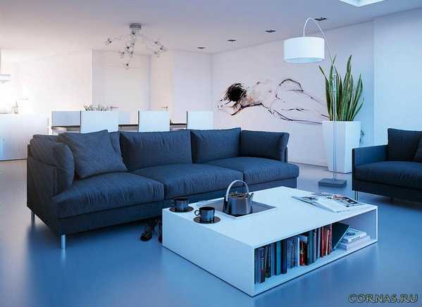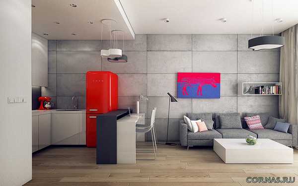 Помещение кухни (зоны для готовки) можно оформить практически незаметной, основная функция, которую она будет «выполнять» — это место для приготовления еды. Мебель выбирайте компактных размеров, нейтральной расцветки, которая будет сливаться с полом и стенами. Здесь главный акцент нужно сделать на зал Вашей квартиры студии. Повесьте большую плазму, установите диван-трансформер (его можно использовать в качестве перегородки между двумя частями квартиры) и небольшой стол. Здесь уже нужно применять яркие краски, можно даже рисунки.