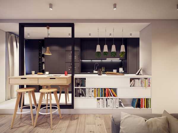 Стол лучше выбрать такой, чтобы складывался. То есть идеально если постоянно за ним может сидеть одни или два человека, ну а если понадобится – Вы его разложите и сможете усадить гостей. Еще, как вариант, можно сделать барную стойку – это достаточно экономит пространство, да и очень стильно.