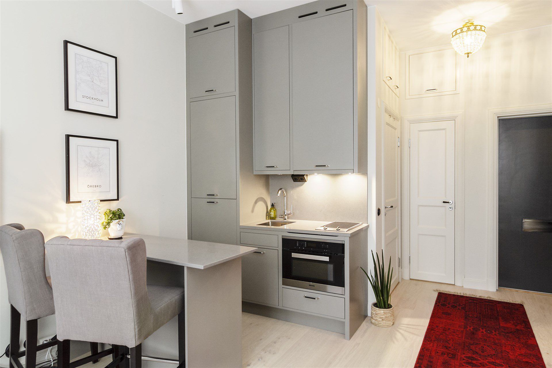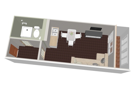 Небольшая квартира студия с двумя дверьми, одна из которых — для входа с улицы, а другая — в ванную и туалет, просто идеальна для семьи из двух человек.