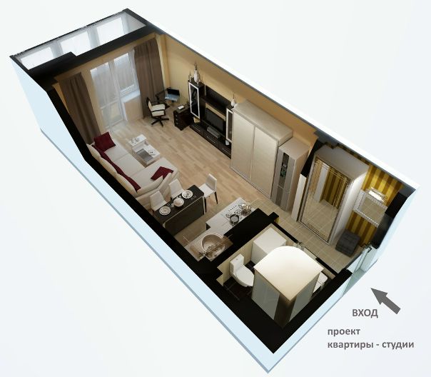 дизайн и планировка, интерьер квартиры-студии, ремонт и оформление прямоугольной студии с балконом, отделка и обустройство