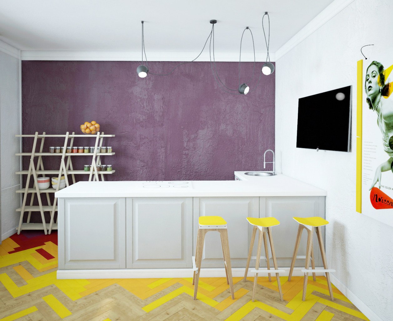 В такой планировке будут гармонично смотреться стены с кирпичной кладкой, а также белый пол и потолок. Мебель следует подбирать в светлых тонах и местами разбавлять обстановку яркими деталями. Например, это могут быть желтые светильники, разноцветные ящики столов и контрастная полоска на кухонной стене.