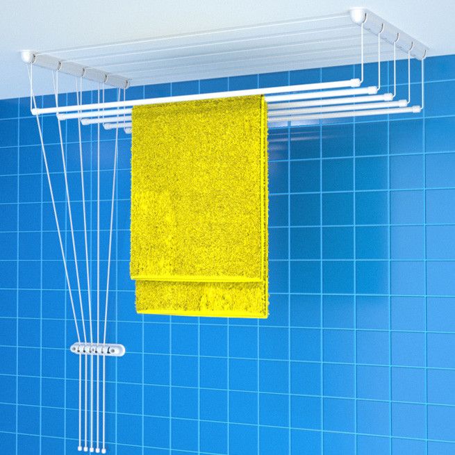 Сушилки с независимым подвесом немного сложнее в установке. Все перекладины крепятся к двум планкам на потолке, но к каждой из них идет веревка, которая и позволяет опускать/поднимать прутья для навешивания белья. Так что при монтаже, кроме установки перекладин на потолке, предстоит закрепить на близлежащей стене еще планку, на которой фиксируются веревки. Перекладины в потолочных сушилках этого типа могут быть сделаны из пластика, стали покрытой порошковой эмалью (Gimi) или алюминия (Лиана). Можно найти деревянные перекладины и других производителей, но перечисленные выше представлены большим числом моделей.