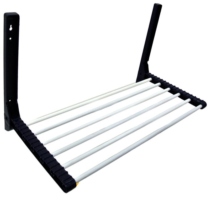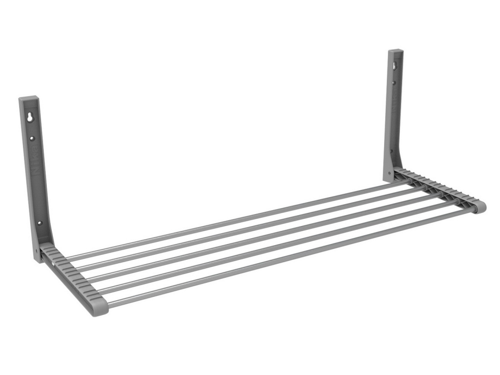 Еще одна разновидность настенных сушилок – откидная. Она состоит из стационарного большого прямоугольного основания и подвижной части в виде рамки с рейками. В нерабочем состоянии они соединены, а при необходимости рамка наклоняется под углом 45 или 90 градусов, и на рейки можно развешивать одежду.