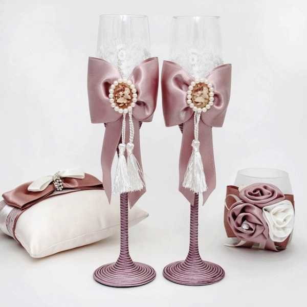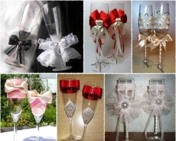 Незаменимые атрибуты свадьбы, чтобы выгодно подчеркнуть индивидуальность, оформляются в разных вариантах. Для украшения бокалов применяются следующие материалы: