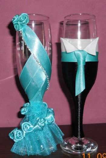 Непременным атрибутом свадебного мероприятия являются бокалы для молодых, в которые наливается шампанское. К фужерам для молодоженов приковано внимание гостей, они постоянно попадают в кадр. По этим причинам свадебные бокалы должны быть оформлены красиво, элегантно, сочетаться с общим стилем торжества. Обычно оформлением фужеров занимаются специалисты в свадебных салонах, но можно изготовить данные свадебные аксессуары самостоятельно.