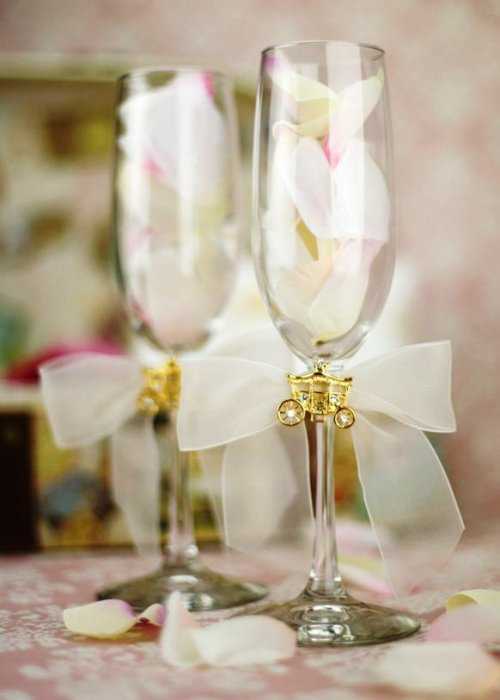 Конечно, вы можете приобрести пару свадебных бокалов украшенных по последним тенденциям свадебной моды, но опять же, если вы хотите значительно сэкономить, лучше взять два обычных бокалов для шампанского, которые наверняка есть в вашем буфете и красиво их задекорировать своими руками.