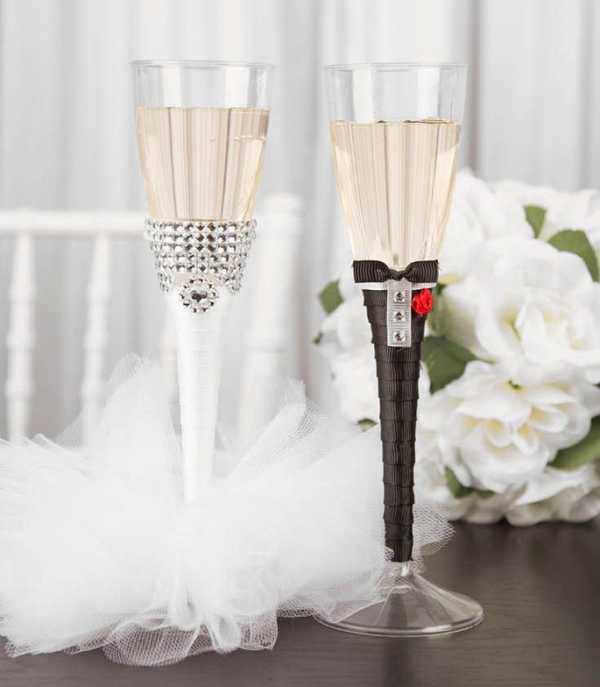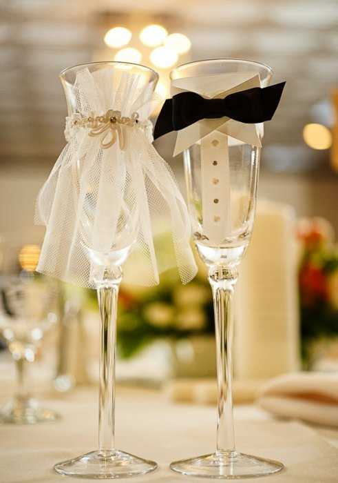 Классический вариант декора свадебных бокалов с черным и белым подойдет для любой классической свадьбы. Бокал невесты можно украсить пышной юбочкой или ленточкой с «фатой», а бокал жениха чаще представляют с бабочкой или галстуком.