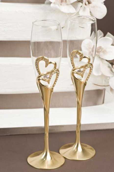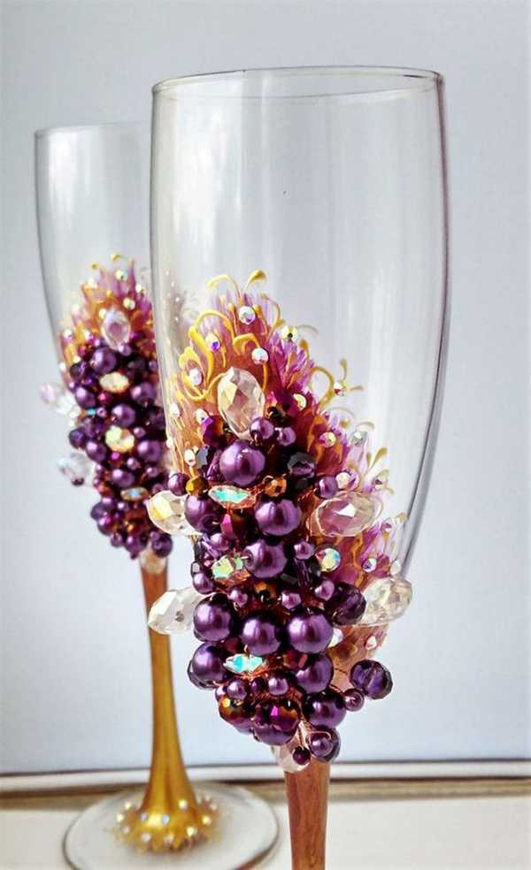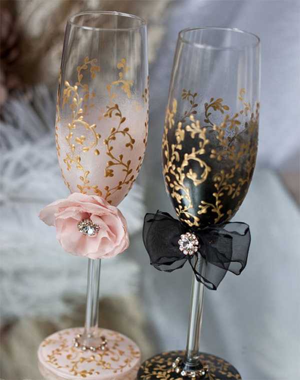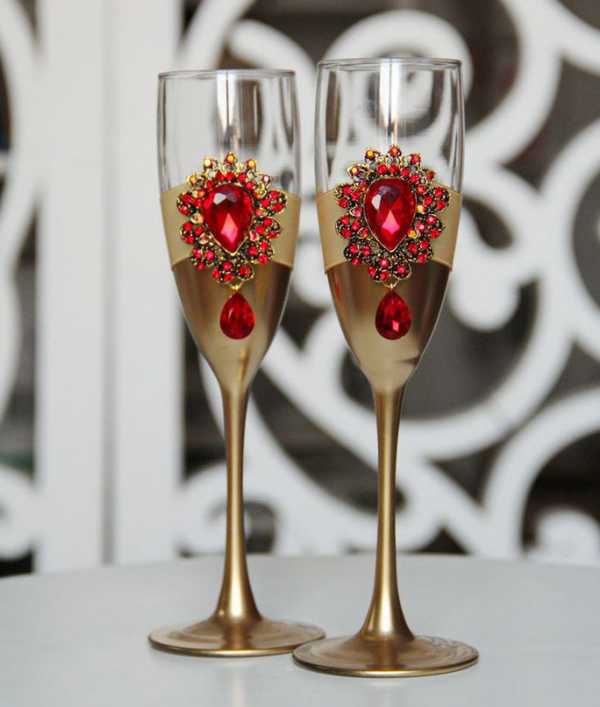 Блеск, стразы, позолота на ножке бокала, золотистые узоры или ободок из золотистой ленточки на чаше смотрятся богато и празднично.