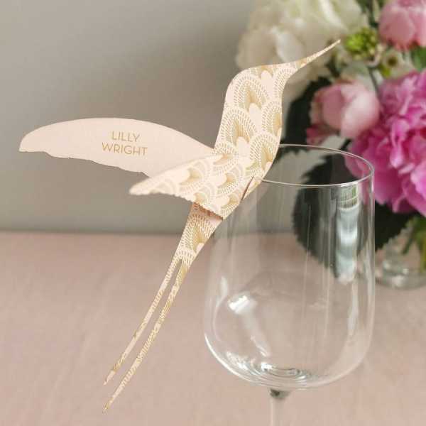 - Картонных тегов на чаше бокала – выглядят такие детали в виде бабочек, цветочков, птичек и т.п. Прикрепляются они обычно на краю чаши бокала с помощью специальных разрезов. Такие милые детали можно использовать в качестве креативных банкетных карточек, написав на них имена гостей.