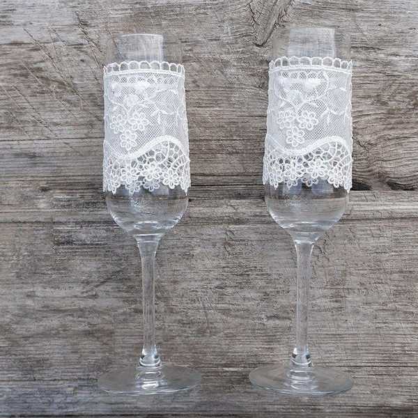 Если ваше свадебное платье кружевное, обратите внимание на романтичное оформление свадебных бокалов 2019-2020 кружевом. Небольшая кружевная полоска вокруг чаши подарит невероятно утонченный и нежный дизайн.
