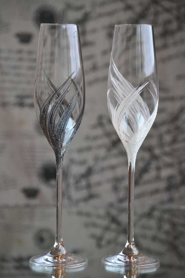 Будет здорово, если бокалы задекорировать крашеными перьями и стразами. Интересно смотрятся аппликации на стекле в виде листочков и причудливых цветов. Из небольших камней бирюзы можно выложить на фужерах имена молодоженов, или расписать бокалы витражными красками.