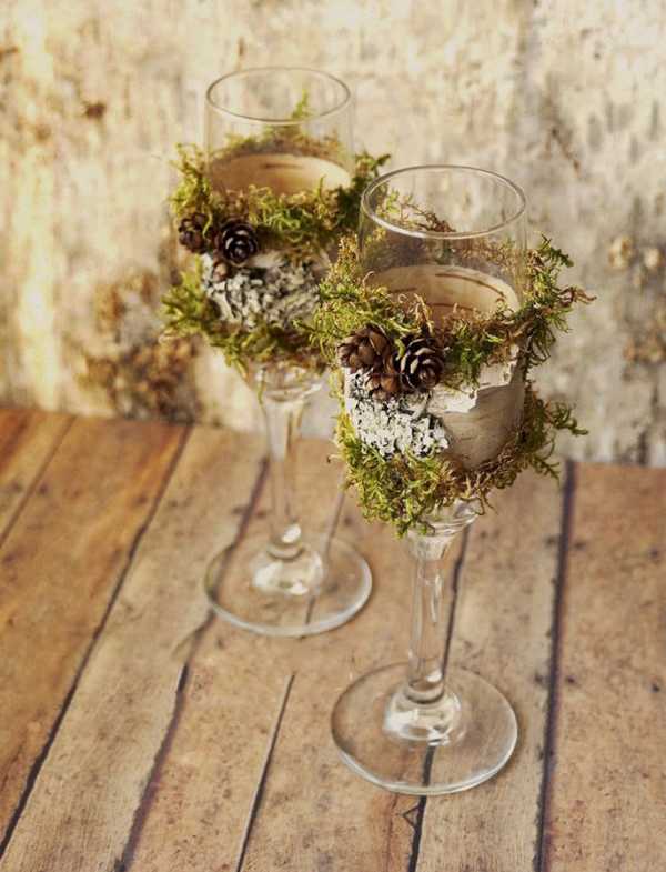 Как оформить свадебные бокалы, подскажет ваша фантазия и выбранные для этого материалы. Жених может вырезать из дерева или склеить из веточек начальные буквы имен, голубей или соединенные сердца, а невеста в это время займется дизайном фужеров, декорируя их мешковиной, цветами и растительными орнаментами. Закрепить элементы на стекле можно клеем, а на ножке – необычными лентами зеленого и красного цвета или суровой веревкой.