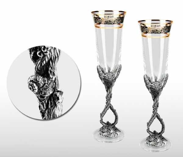 - С гравировкой. На каких фужерах делают гравировку в виде имен молодоженов или выбивают краткую клятву верности. Для такого вида оформления подходят металлические или стеклянные бокалы. Однако во время свадебного торжества необходимо следить за правильным положением бокалов, чтобы на фотографиях была видна вся часть гравировки.