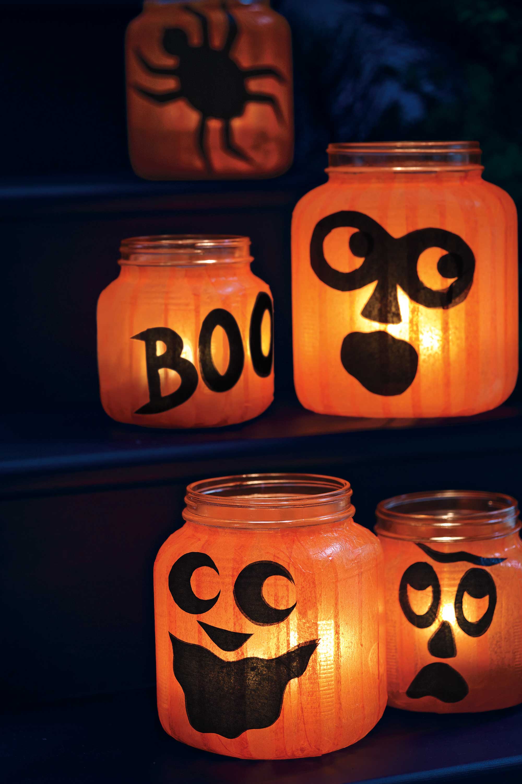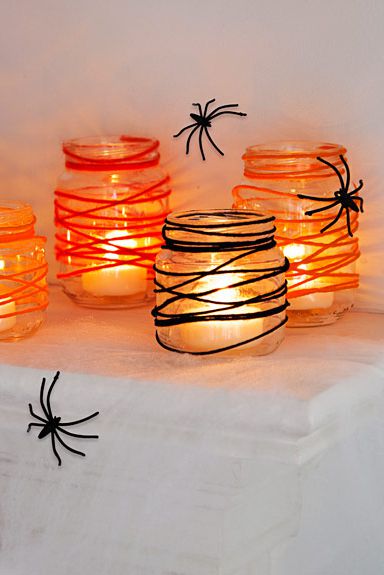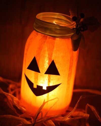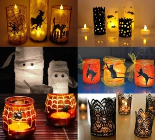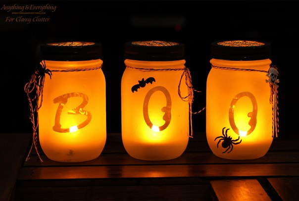 Отличная идея для Хэллоуина – это светильники из банок, из них получатся простые, но симпатичные подсвечники, которыми можно украсить крыльцо, бордюры и подходы к дому. Своими руками обклейте их цветным пергаментом или просто покрасьте гуашью, изобразите на них бандитские рожицы, паутину, призраков и пауков – готово!