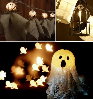 Хотите напугать своих гостей настоящими привидениями? Нет ничего проще! Вам понадобится марля и крепко заваренный крахмал. Лоскут необходимого размера опускаем в раствор, слегка отжимаем и вывешиваем на перевернутую пластиковую бутылку для высыхания. Рисуем черной гуашью рот и глаза, для подсветки в целях противопожарной безопасности лучше использовать светодиодные лампочки.
