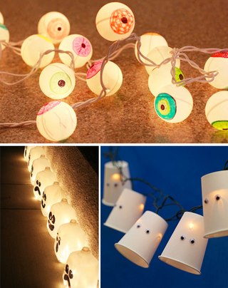 Кстати, новогодняя гирлянда – просто кладезь для воплощения самых безумных осветительных идей в духе Хэллоуина. Шарики для пинг-понга в виде светящихся в темноте глазных яблок или одноразовые стаканчики-призраки, мигающие в такт гирлянде, скажете – не весело? Еще как!