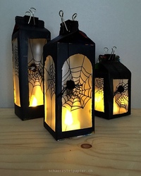 Стильные светильники из черного картона с полупрозрачными вставками из желтого пергамента сделать проще простого. Вырежьте трафарет, подходящие картинки для пергамента можно найти в Интернете и распечатать их на принтере. Заклейте окошки в картоне пергаментными рисунками, сложите трафарет по линиям сгиба и склейте края. Такие хэллоуинские абажуры можно и подвесить, украсив ими обычные лампочки, а можно просто поставить на стол, поместив внутрь горящие свечи.