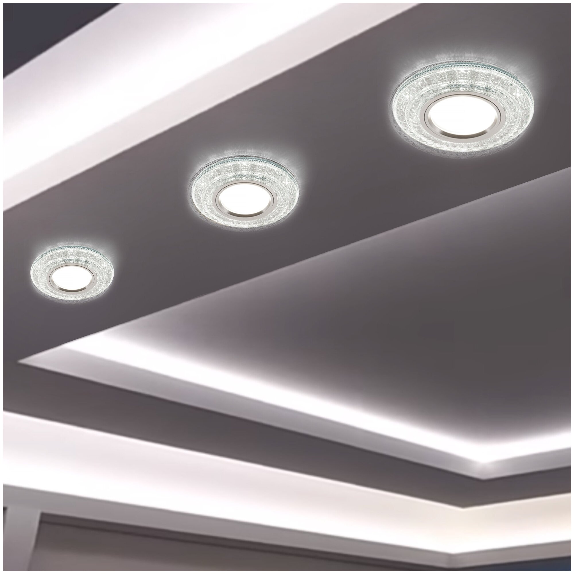 Для такого освещения используют расположенные рядами встраиваемые точечные устройства, дополненные по контуру светодиодной лентой, которая и создает красивый эффект. Отдельные акценты можно расставить при помощи спотов, создающих направленные световые потоки, или же цветной подсветки, выполненной светодиодной лентой.