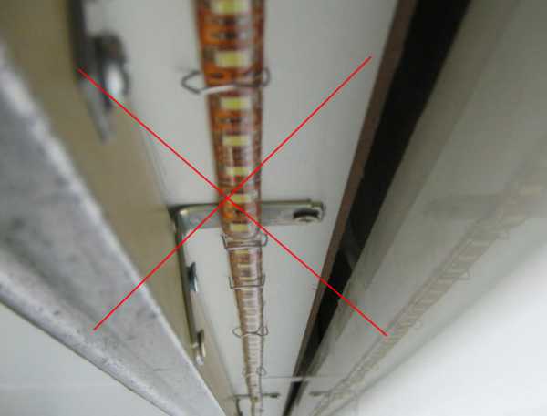 1Первая и самая главная ошибка – это наклеивание мощной ленты без всякого профиля, непосредственно на поверхность потолка, стены, шкафчика, короба и т.п.