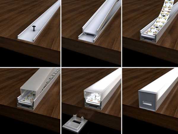 Со всеми секретами по правильному выбору, монтажу и характеристикам данного профиля, подробно говорится в статье ниже.Сама лента в профиль также наклеивается на скотч. Здесь благодаря идеально ровной поверхности, держаться она будет гораздо надежнее, чем на стене или деревянном основании.