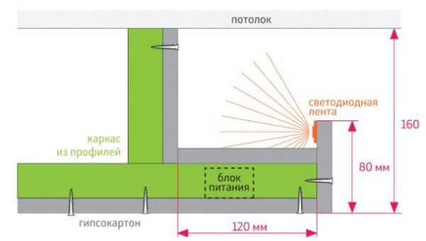 Закрепление в нише, довольно не простой способ освещения, который требует специального короба из гипсокартона. Вот например схема такого сооружения.
