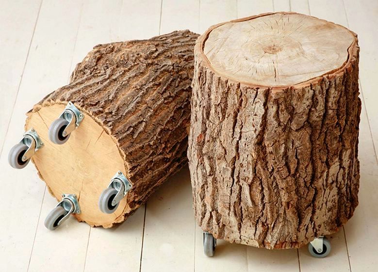 На фото вверху использованы тонкие стволы, на фото справа — старый спил дерева