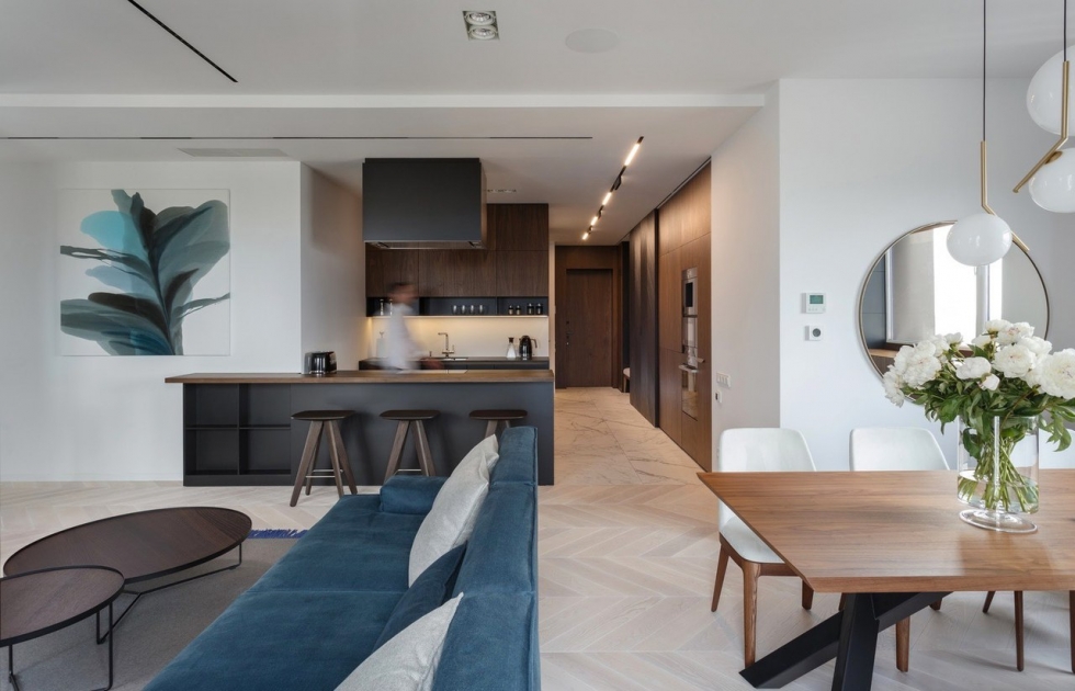 Пространство в этой квартире поделено на две зоны — общую и приватную. Согласовав между собой все необходимые функциональные пятна, дизайнеры создали жилую среду, в которой каждый член семьи имеет личную зону комфорта. Впрочем, немалое значение придается и сценариям безбарьерной части квартиры, где в итоге классически разместились кухонная, обеденная и гостиная зоны плюс рабочее место в примыкающей нише. Проект Park — это история еще и о том, как удачно может быть вписана концепция open space в жилье для семьи с ребенком, базово предполагающее строгое разделение на обособленные пространства.