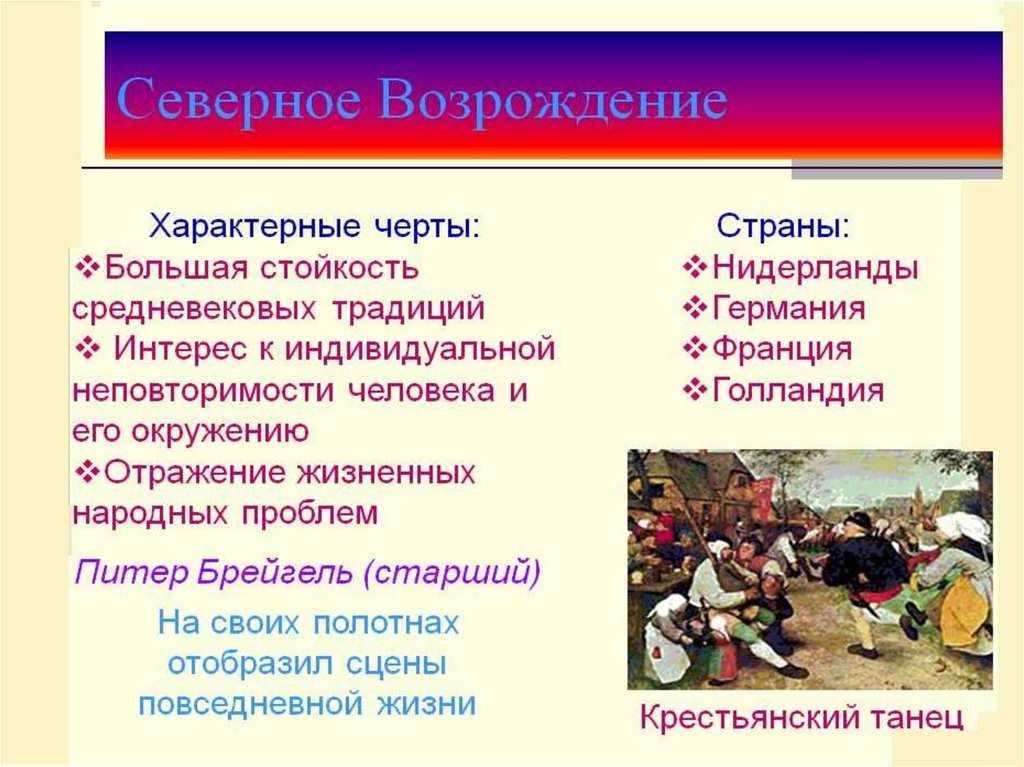 Особое место в мировой культуре эпохи занимает Северное Возрождение. Главные идеалы художественной культуры Северного Возрождения: