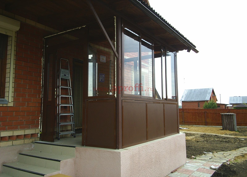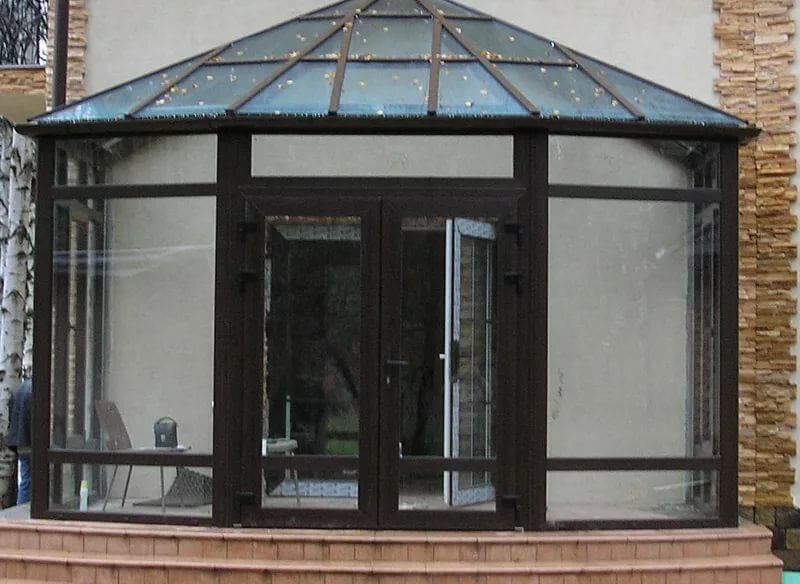 - Стекло. Стеклянная входная зона чаще всего встречается в виде веранды. Проект обойдется недешево, но выглядеть будет очень красиво. К недостаткам также можно отнести трудоемкий процесс очистки стекол.