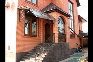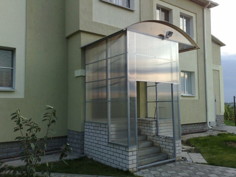 Подойдут для холодных и теплых тамбуров. Преимущества: экономичность, прочность, прозрачность, отличная защита от ветра, простая установка. Из поликарбоната можно сделать полукруглую постройку. - Кирпич. Хорошо смотрится с кирпичными коттеджами. Плюсы: зачастую не нужна внутренняя отделка, конструкция долговечная и хорошо закрывает жилую часть от холода.