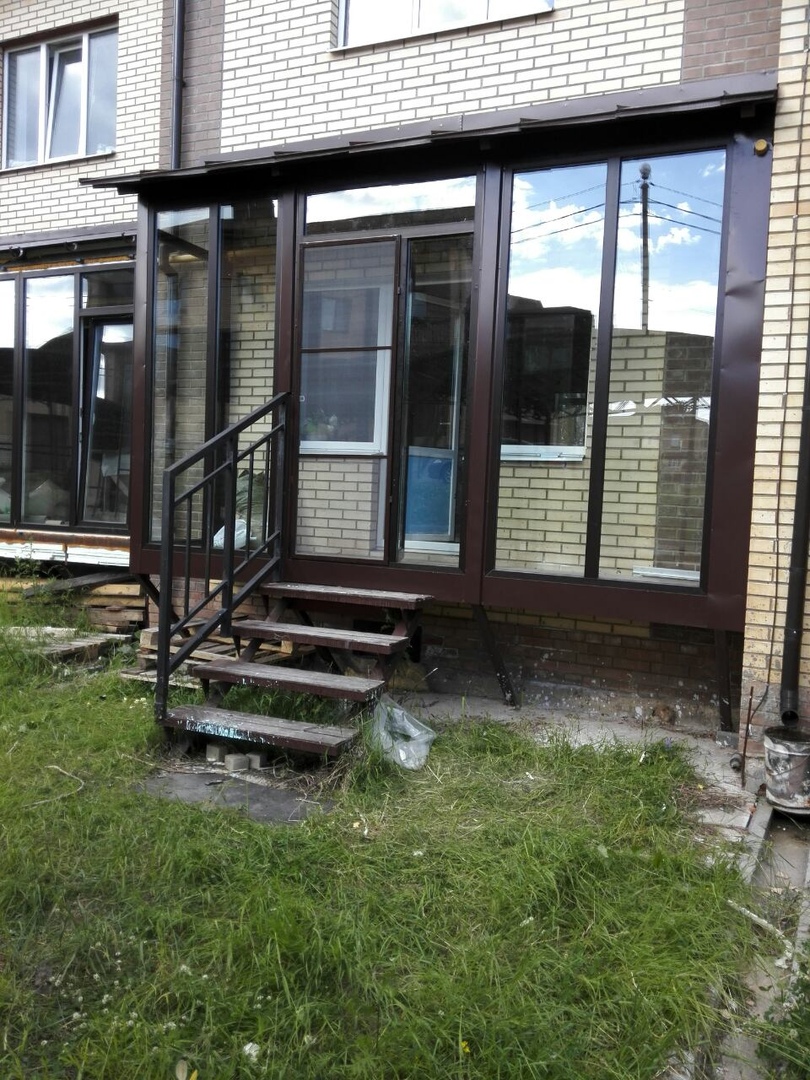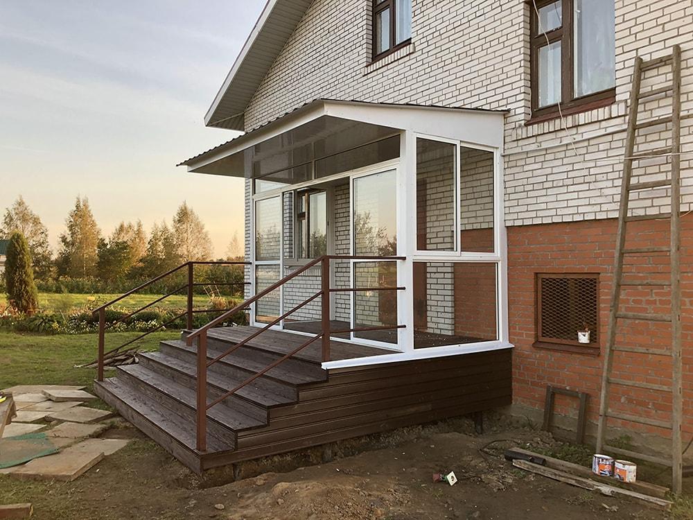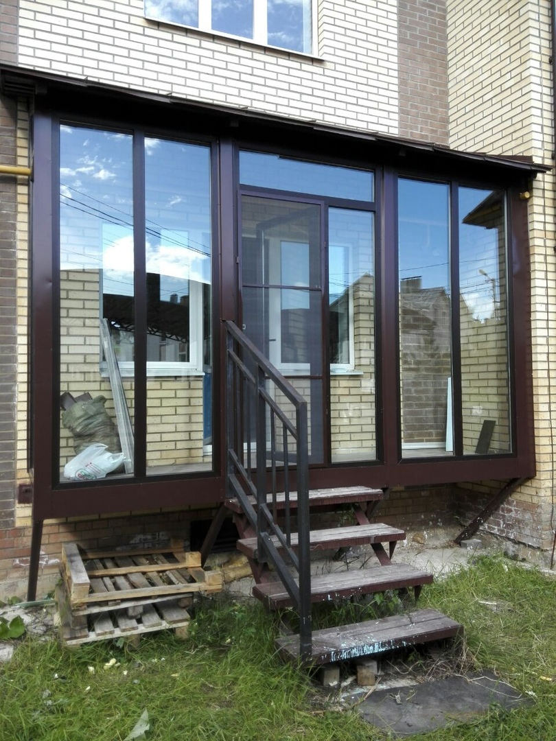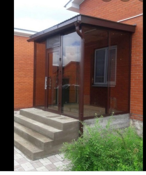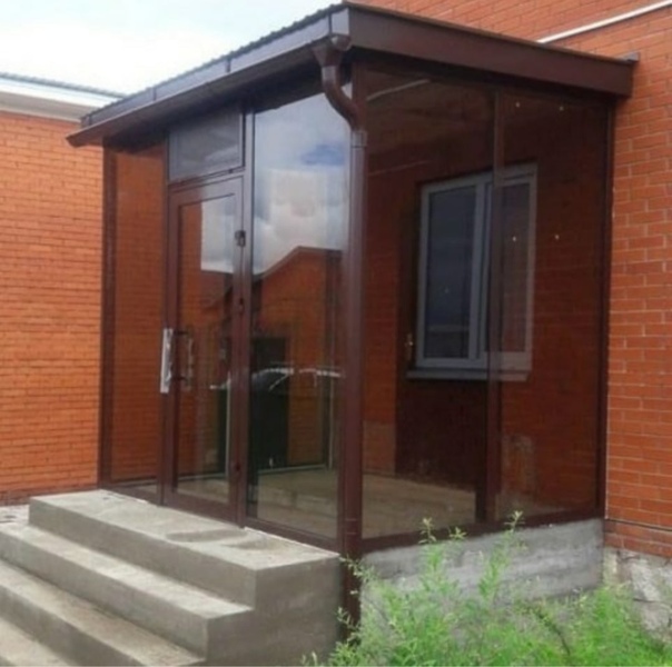- Стеклянный тамбур нередко делают для использования его в качестве веранды. Можно сделать полностью открытые стеклянные стены и потолок на каркасе.