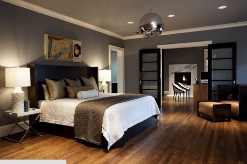 В спальне с темными стенами следует организовать правильное освещение. Здесь не обойтись без настенных бра, прикроватных торшеров и ламп, ночных светильников.