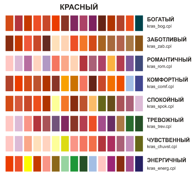 От центра чисто-красного цвета в сторону желтого идут более теплые оттенки (красный с примесью оранжевого, соседнего цвета), а в сторону фиолетового — более холодные (красный с примесью фиолетового) и т.